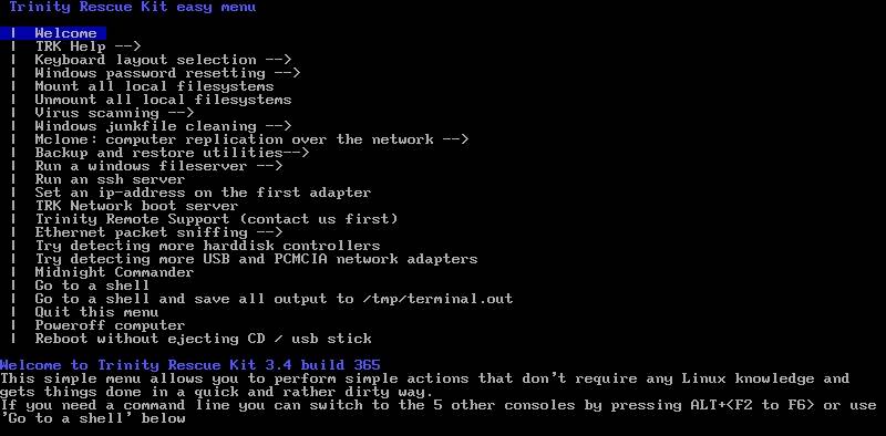 A Trinity Rescue Kit kifejezetten a gyakori Windows és Linux problémák figyelembevételével készült. Az alkotó, Tom Kerremans készítette a Live CD-t, hogy újjáélesítse a gyengélkedő rendszereket számos vírus- és rosszindulatú programkereső, jelszó-helyreállító eszközök, partíció-helyreállító eszközök és meghajtóklónozó segédprogramok segítségével.