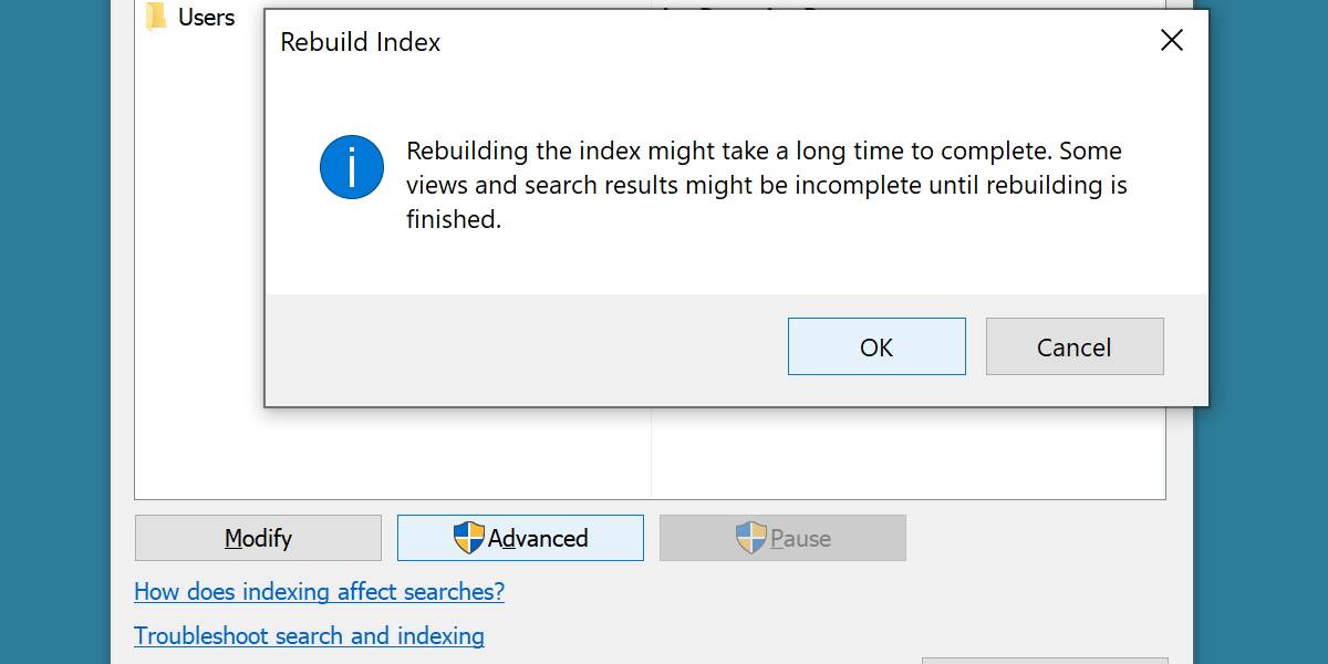 Kattintson erre a gombra, és nyomja meg az OK gombot. A Windows megkezdi a keresési adatbázis újraépítését. Ez eltart egy ideig, és rövid időre letilthatja a keresést.